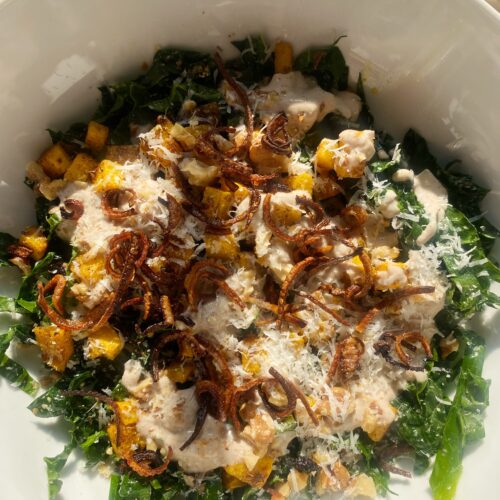 Kale & Squash Winter Salad with Creamy Walnut Dressing and Crispy Shallots