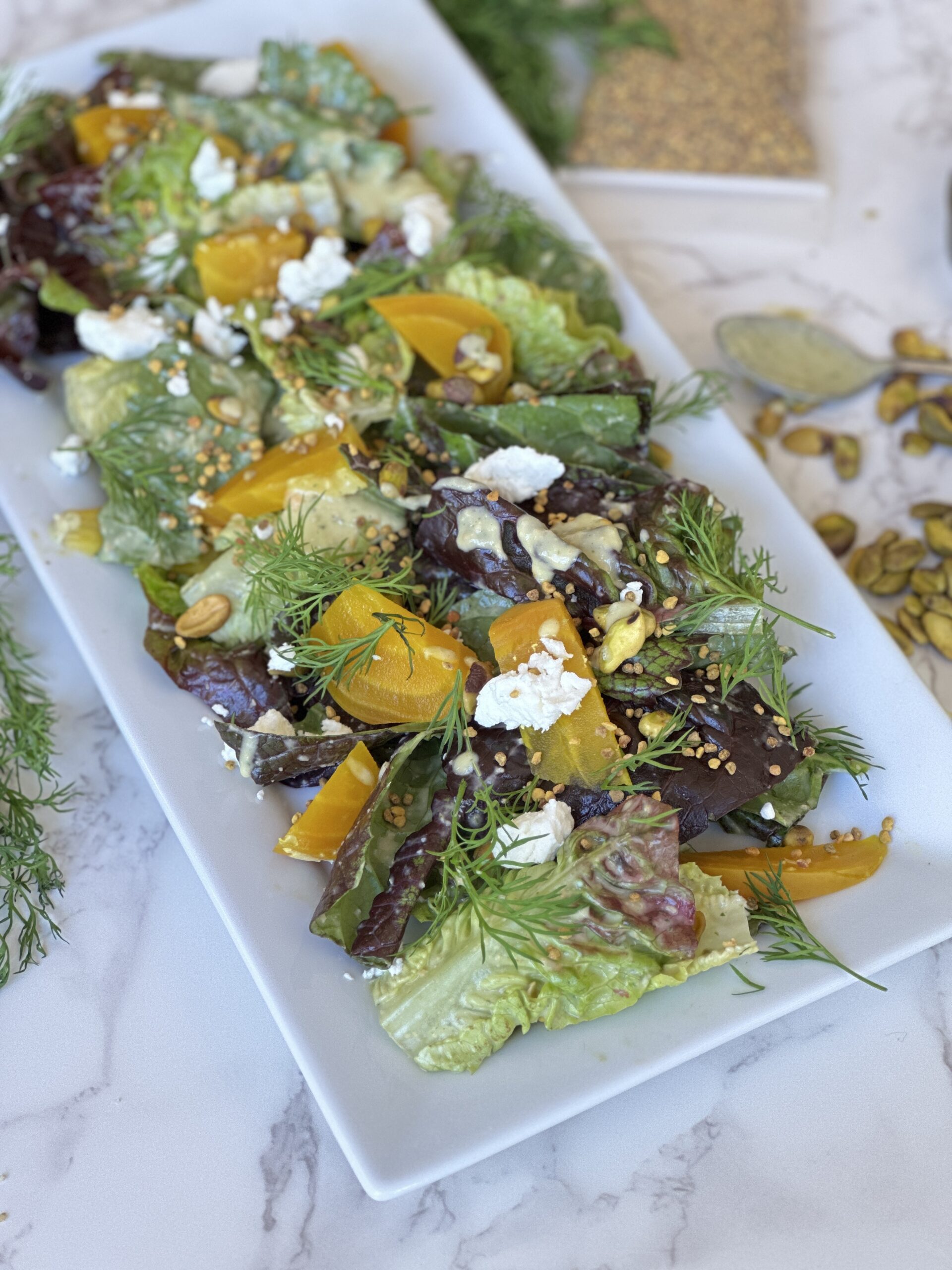 - In a mixing bowl, put about 4 tbsp of the salad dressing, add your greens and toss. Plate greens on a serving platter. Add beets around the plate, on top of the salad, add goat cheese and toppings, finish with an extra drizzle of the vinegrette.