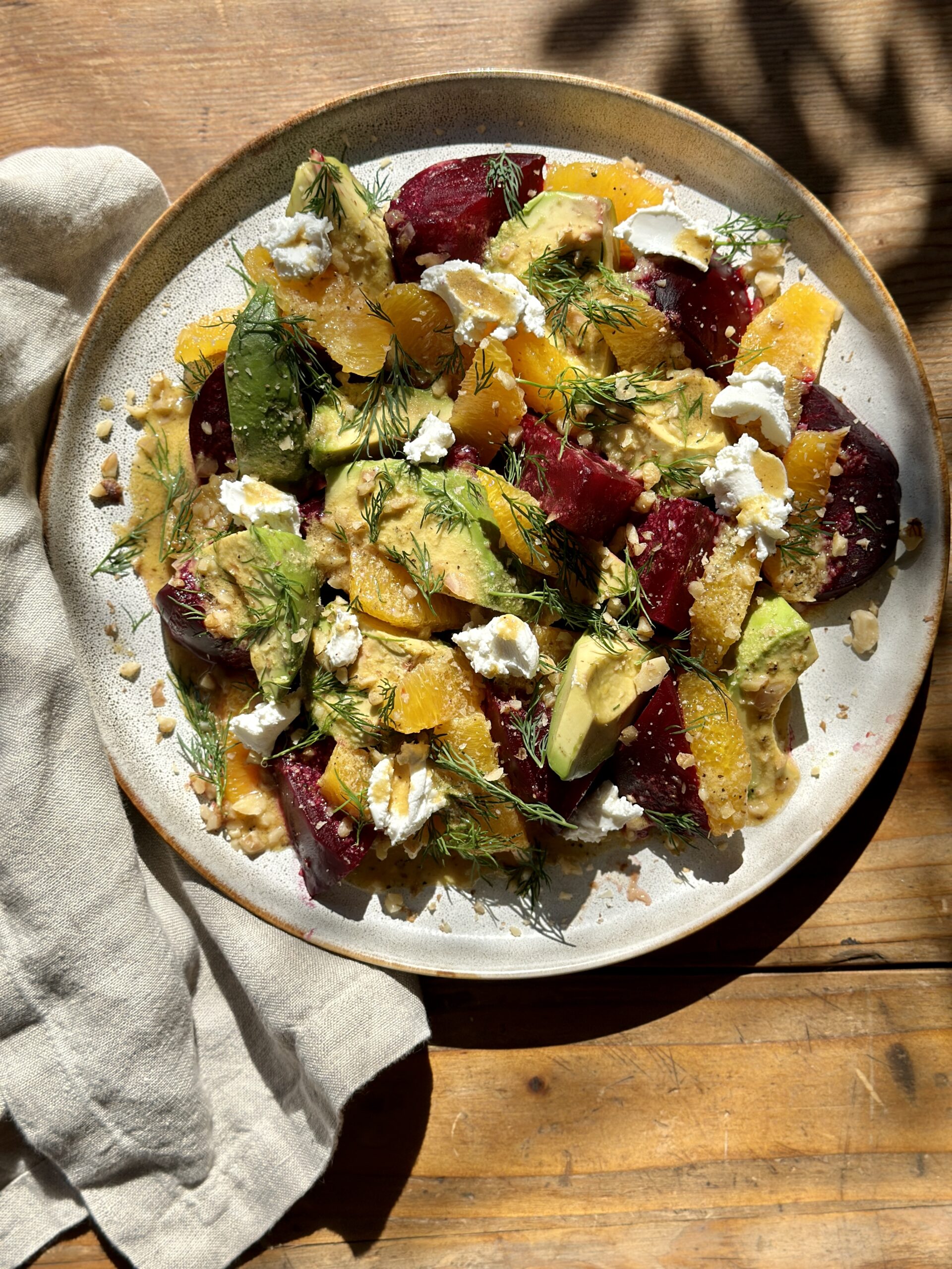 - Bring a pot of salted water to a boil. Drop unpeeled beets in and cook for about 45 minutes on at a low boil. Remove and let cool. Meanwhile, supreme your oranges and slice up the avocado into large chunks. Chop the walnuts. Once the beets are cool, easily peel off the skins and chop into large, irregular chunks. Place the beets, oranges and avocado haphazardly on a plate