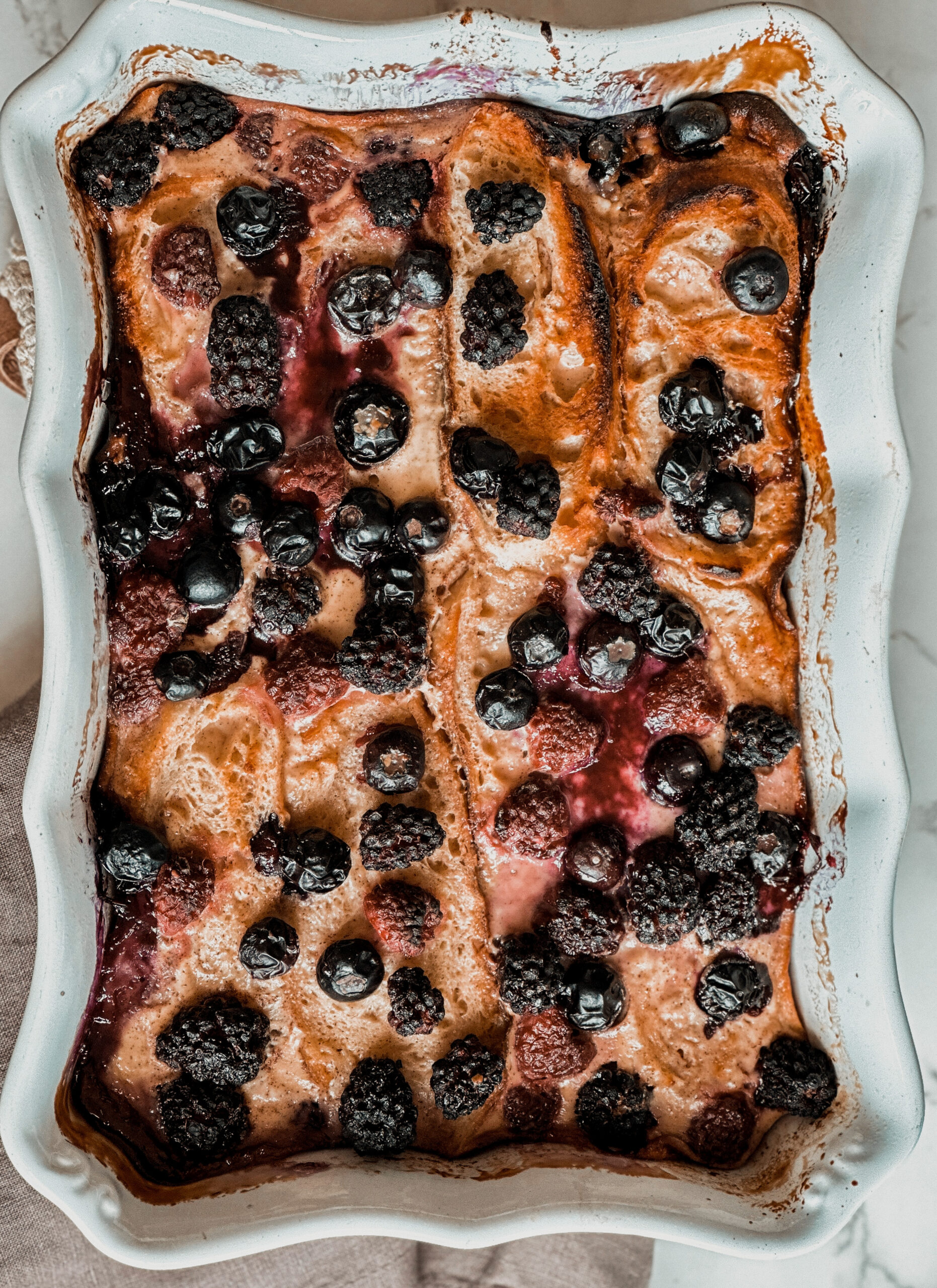 - Slice the baguette on a deep angle, about ½” thick per slice. Arrange slices of bread in the dish and top with the berries, pour over the mixture and let stand 15 minutes (you can also prep this the night before, cover and keep in fridge, then bake in the morning). Bake for 45-60 minutes, until the top is dark brown and crispy
