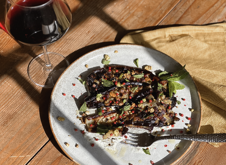Charred Eggplant with Spiced Yogurt and Pink Peppercorns