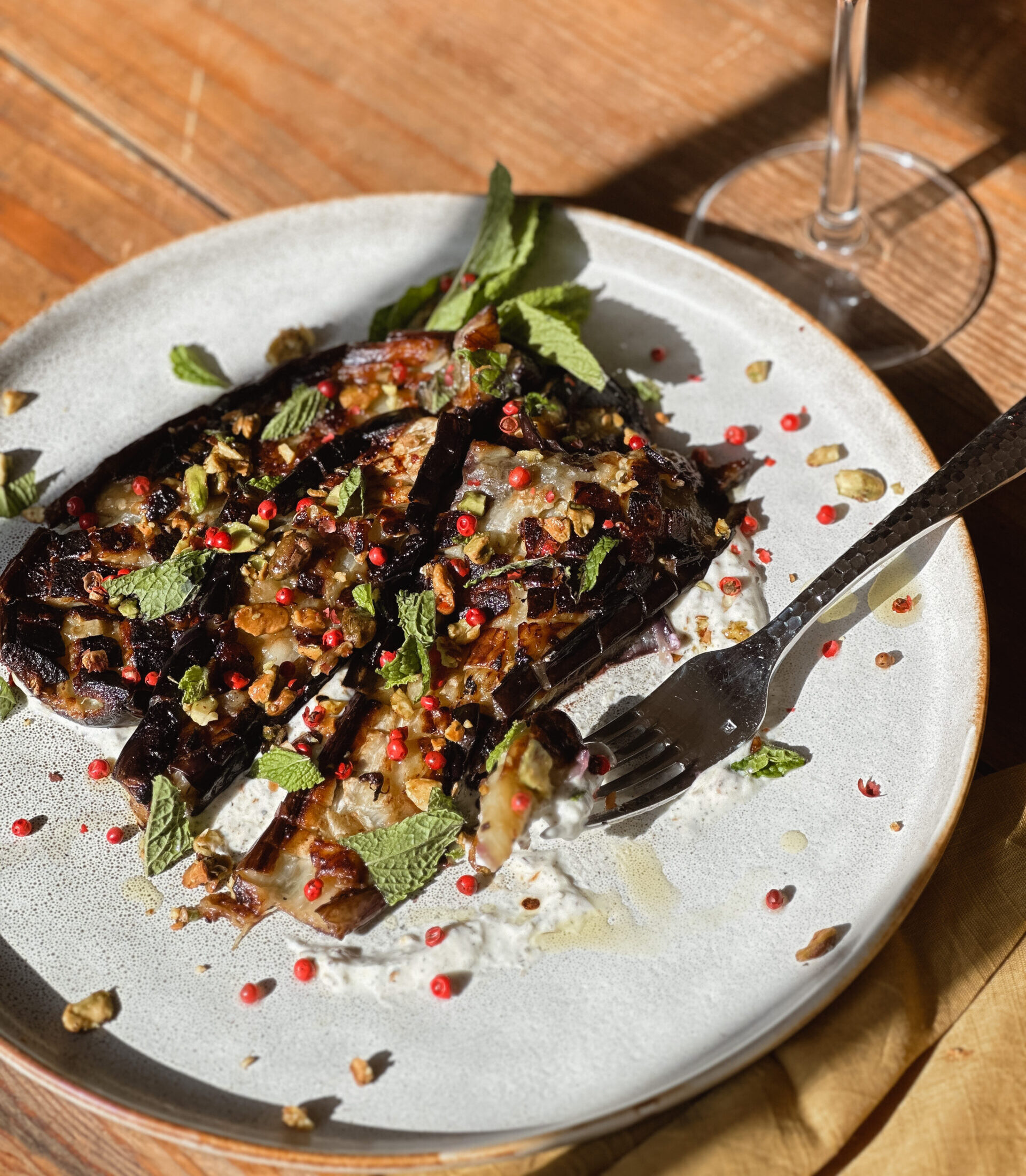 Charred Eggplant with Spiced Yogurt and Pink Peppercorns
