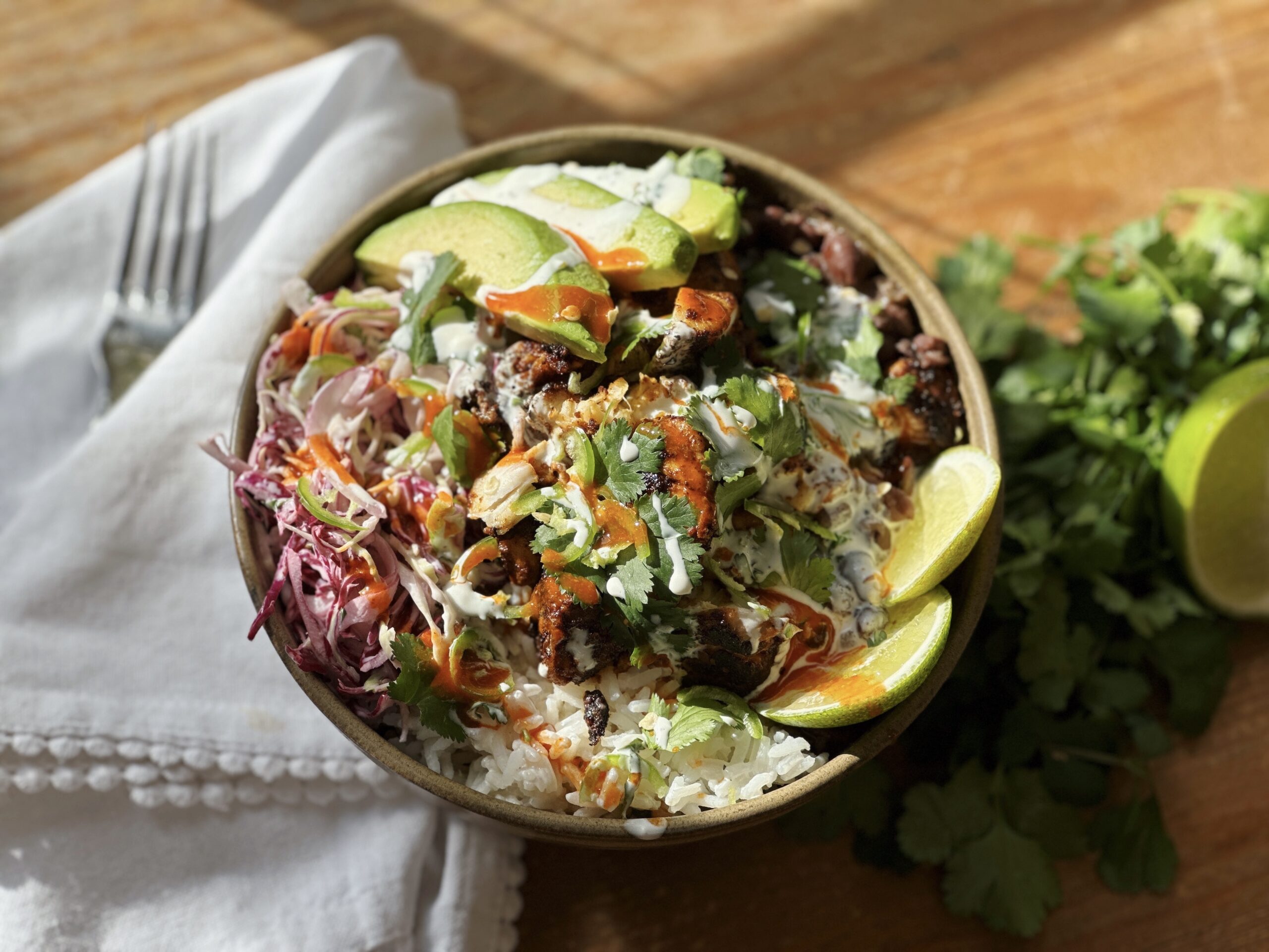 7. Time to assemble, layer the rice, beans, and cabbage, then top with fish. Add avocado slices, chopped cilantro, a good squeeze of lime, and your favorite hot sauce. Serve warm.