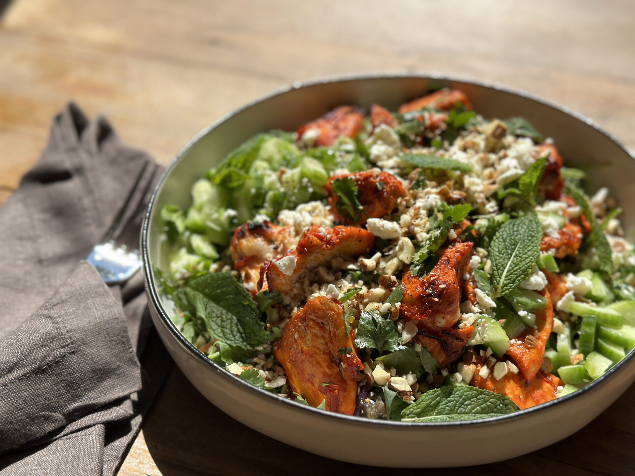 I had fun concocting this one. A few months ago, I started a series called “Kitchen Sink Recipes”. Basically, I create something delicious out of whatever I happen to have in my fridge at that moment. This could be anything from a pasta, salad, tacos, an omelette, you name it. It’s fun because you just don’t know what you’re gonna end up with. The limitations force you to get creative and I love a challenge. So, on this day I had some boneless skinless chicken breast and a jar of harissa that I have never cooked with before. I’ve seen many people use it, but I haven’t made anything with it before. I thought now is a good opportunity. I also had some cooked lentils, some fresh herbs, greens, feta, and some other odds and ends. I just started pulling things out of the fridge and seeing what looks like it would go well together and with the harissa. What I ended up with was something my girlfriend exclaimed “this could be sold in the prepared food section at Erewhon”, and it is now on her favorites list for on-the-go lunches.