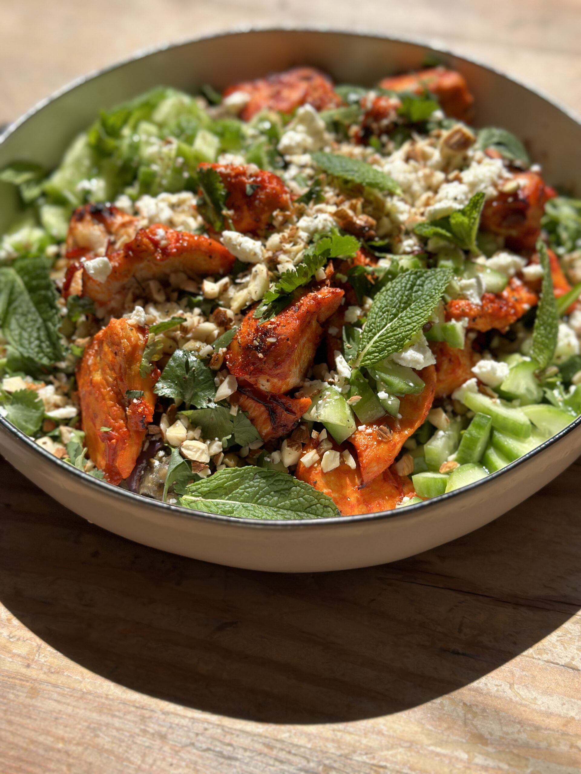I had fun concocting this one. A few months ago, I started a series called “Kitchen Sink Recipes”. Basically, I create something delicious out of whatever I happen to have in my fridge at that moment. This could be anything from a pasta, salad, tacos, an omelette, you name it. It’s fun because you just don’t know what you’re gonna end up with. The limitations force you to get creative and I love a challenge. So, on this day I had some boneless skinless chicken breast and a jar of harissa that I have never cooked with before. I’ve seen many people use it, but I haven’t made anything with it before. I thought now is a good opportunity. I also had some cooked lentils, some fresh herbs, greens, feta, and some other odds and ends. I just started pulling things out of the fridge and seeing what looks like it would go well together and with the harissa. What I ended up with was something my girlfriend exclaimed “this could be sold in the prepared food section at Erewhon”, and it is now on her favorites list for on-the-go lunches.