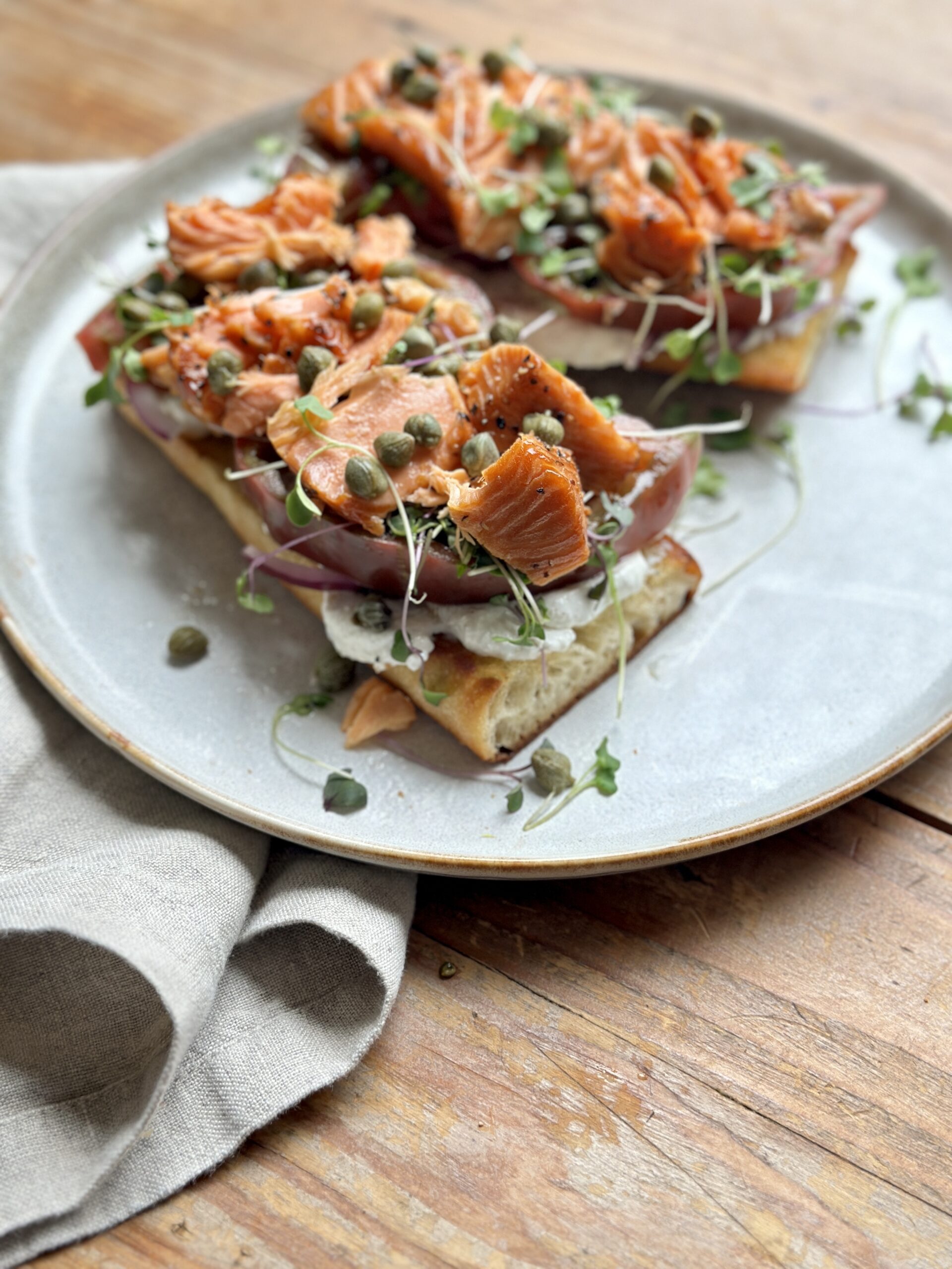 - Slice the tomato, red onion and wash the microgreens. Assemble the toasts by first adding a thick layer of the caper cream, then red onion slices, tomatoes, greens and then break up the salmon over the top. I finish by adding a few whole capers on top, a drizzle of olive oil and another squeeze of lemon juice.