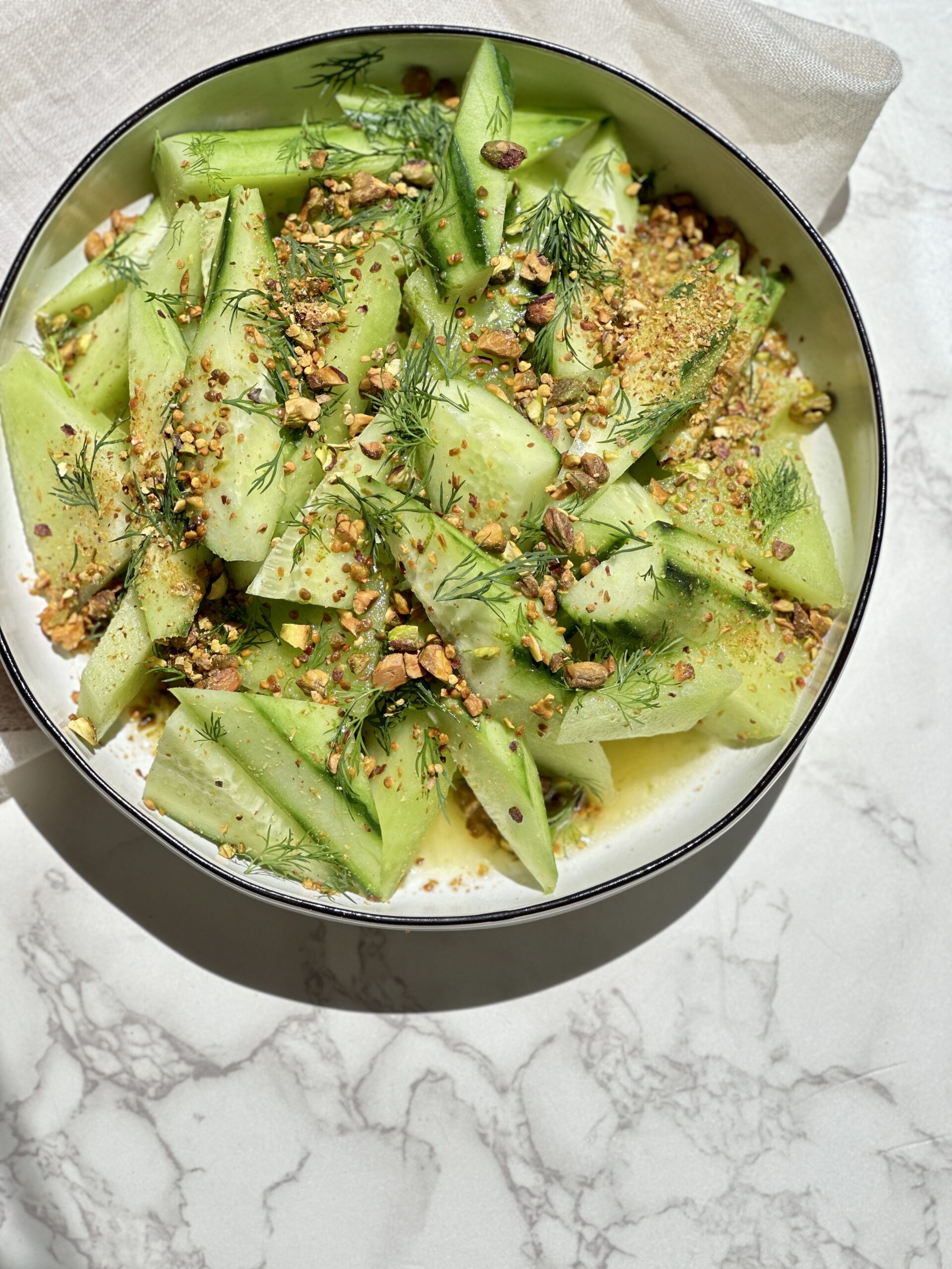 - Make the dressing by simply adding all the ingredients to a container and shaking very well. Pour over the melon and cukes, add the fresh dill and crushed pistachios on top and toss well.