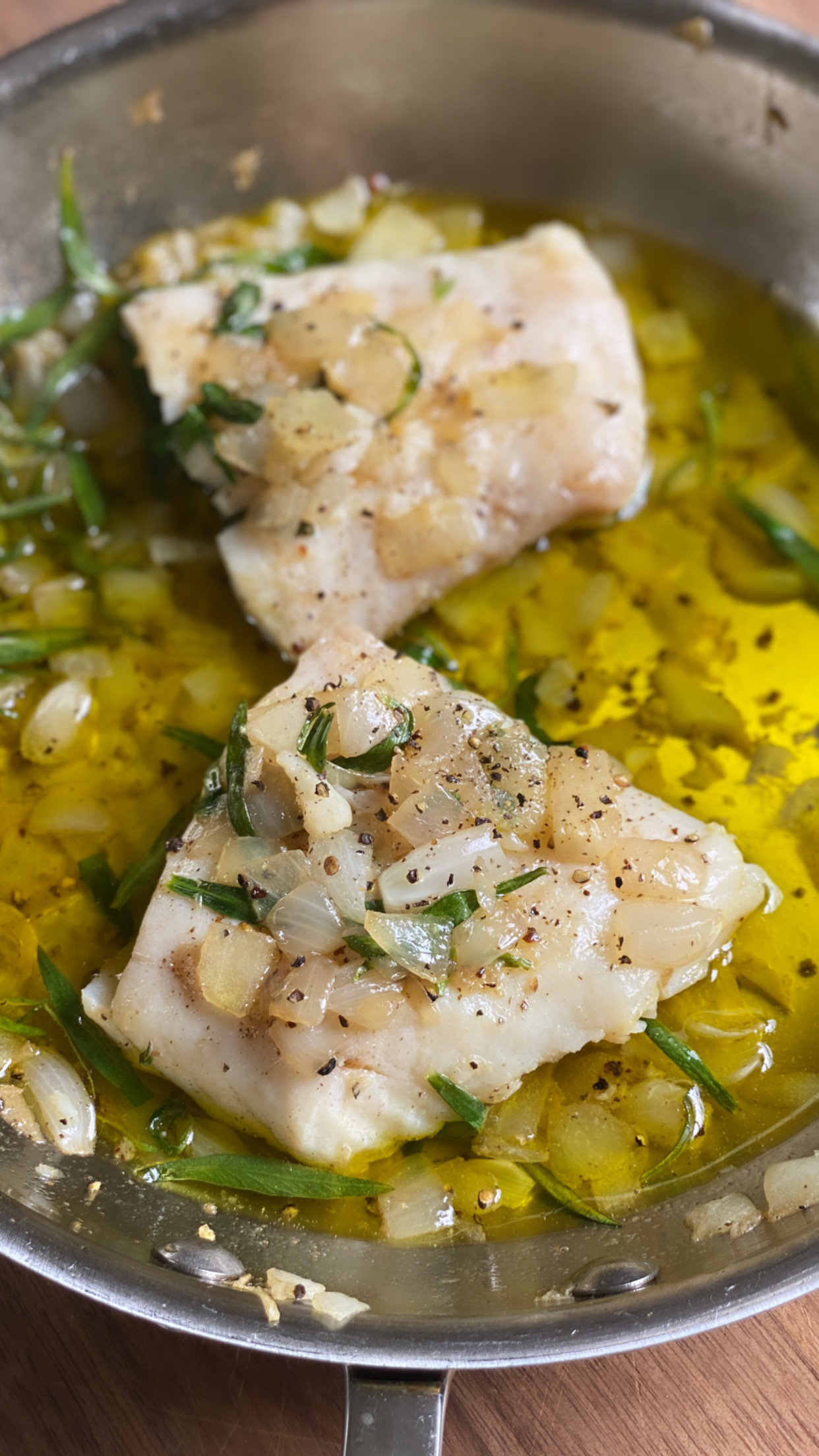 Olive Oil Poached Whitefish with Tarragon & Sweet Onions