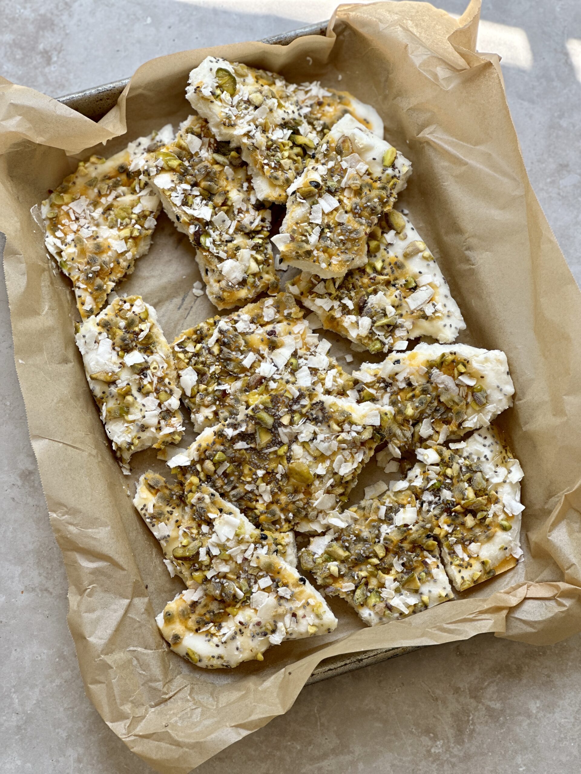 - Mix yogurt, vanilla, honey and coconut flakes together in a mixing bowl. Prep a sheet pan with a piece of parchment paper. Spread yogurt mixture onto tray, making some valleys for the passionfruit to fill in. Next, spoon over the passionfruit and lightly swirl with a spoon. Top with pistachios, more coconut flakes, pistachios and chia seeds. Finish bby adding a drizzle of honey over the top. Freeze at least four hours, or overnight. Break apart and enjoy. I like to thaw it out for 10-15 minutes before eating.
