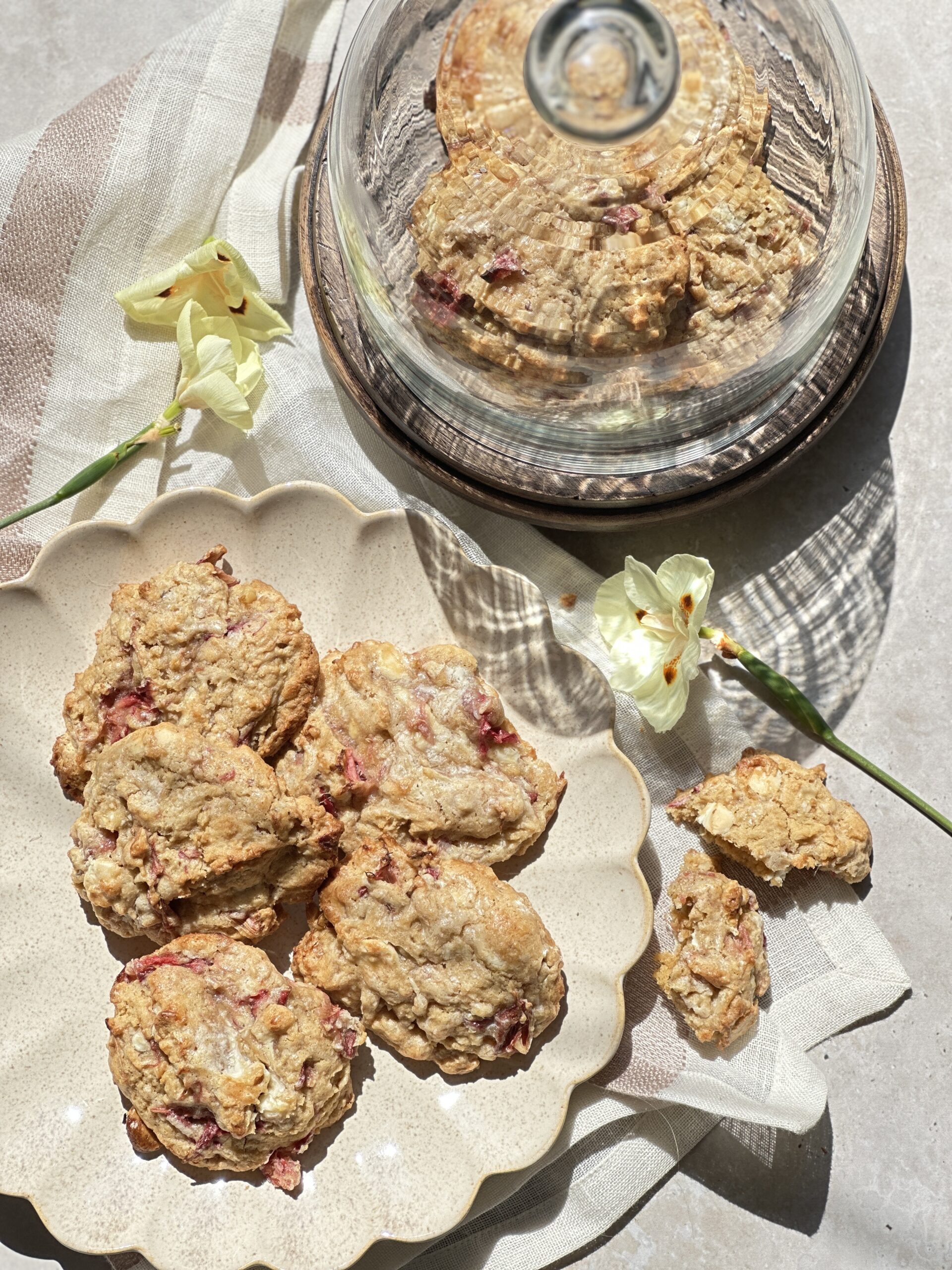 The rhubarb in these cookies keeps them moist, slightly fruity, and a little jammy. The white chocolate just tastes decadent, and the walnuts add the perfect amount of texture. You can even double this recipe and freeze some of the dough so you always have something sweet on hand (Pro-Tip*).