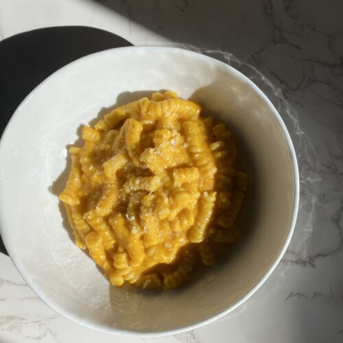 • Remove squash from oven and let cool. In a blender or food processor, add squash, squeeze out the garlic cloves and add them along with the cashew milk, parmesan and chicken broth. Blend until smooth. Place about a tablespoon of ghee into a hot pan, pour squash mixture and cook for a few minutes. Add the additional melting cheese and some pasta water.