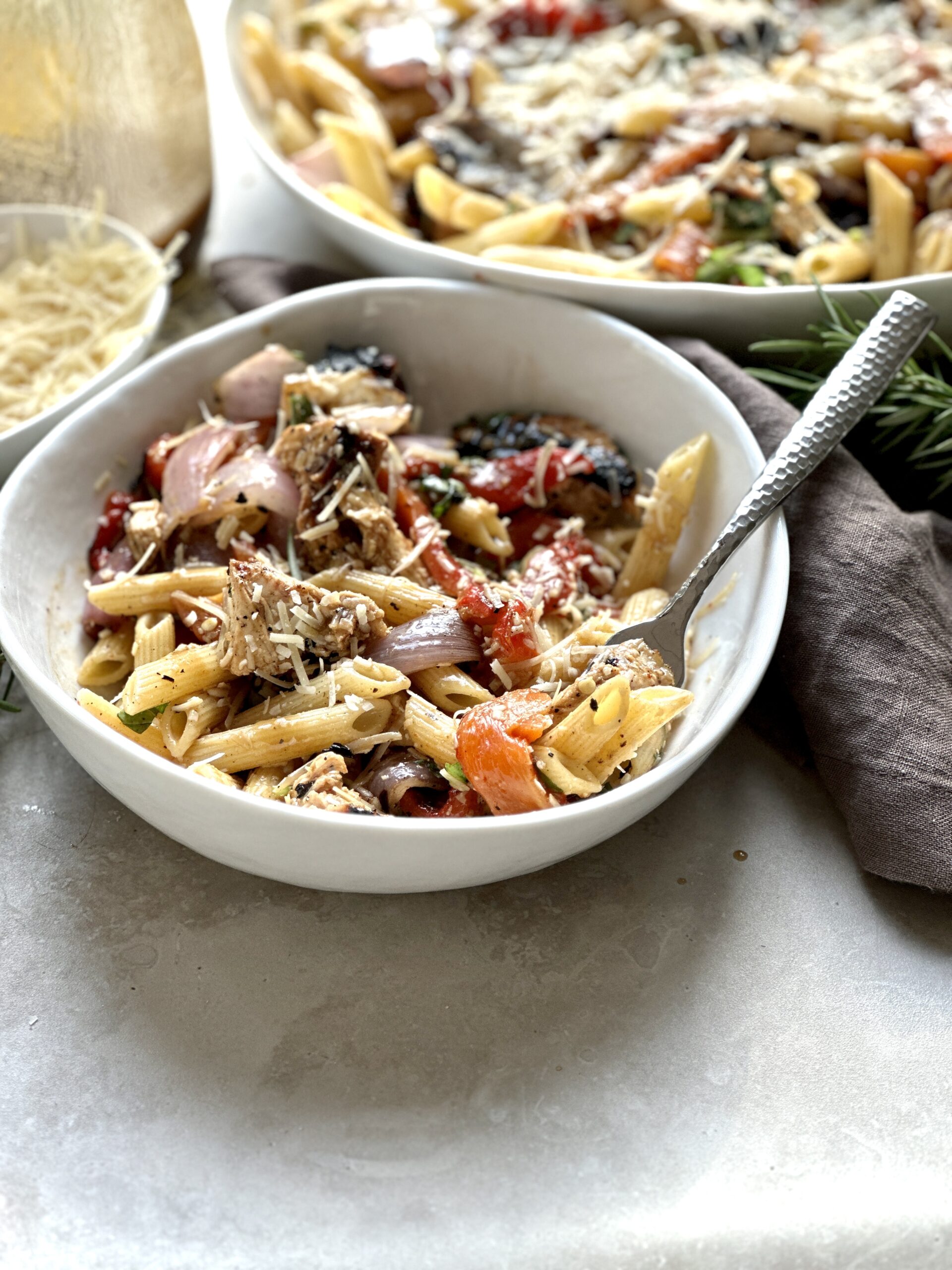 - Once chicken is cooked all the way through, remove, slice and add to pasta as well.