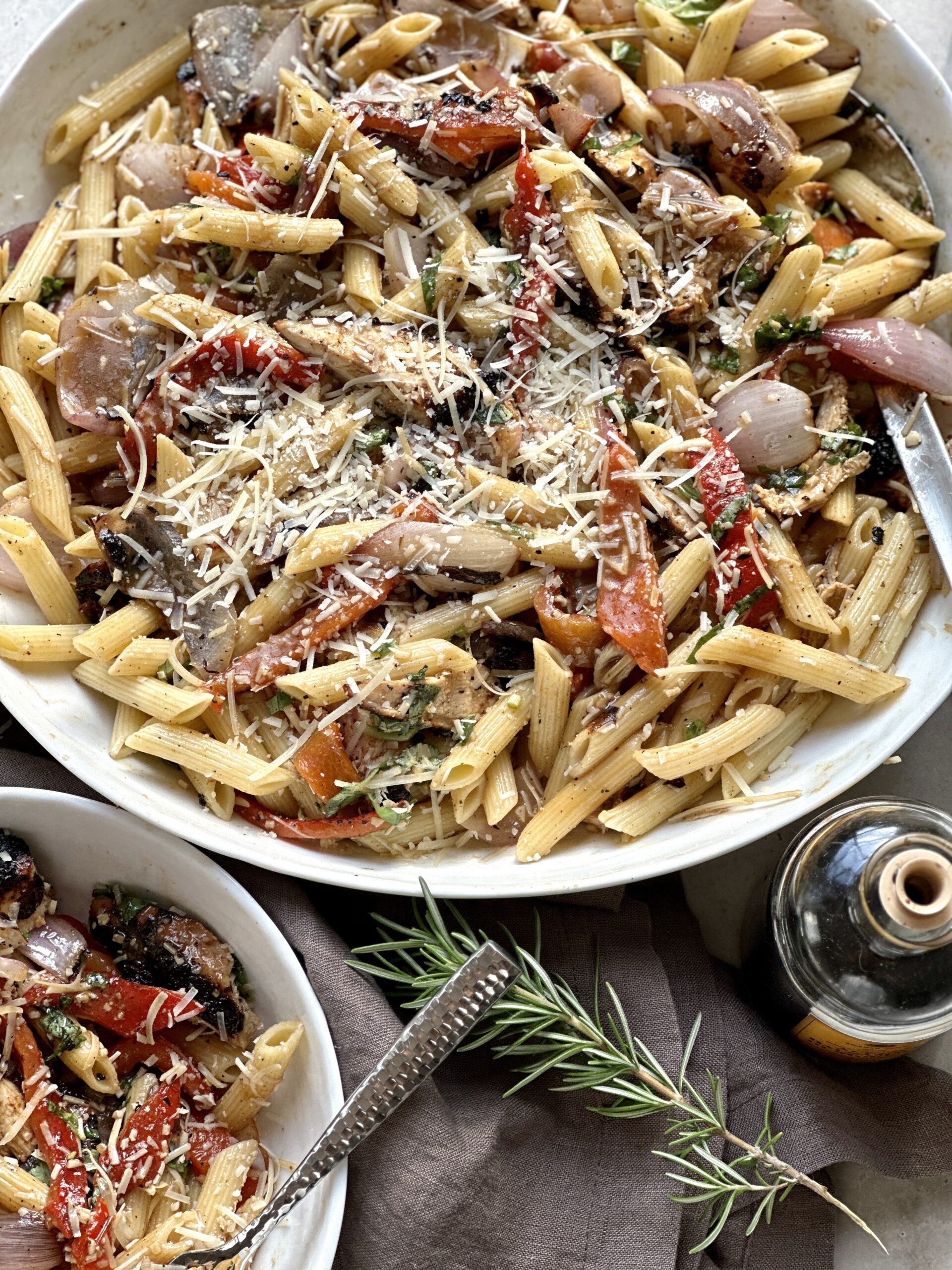 The charcoal-fired flavors really come through with the grilled chicken, bits of charred and tender red onions and those beautifully softened red pepper strips, hit with the freshness of the basil and saltiness of the parmesan. I might serve this with a tray of antipasti and make a real American/Italian feast out it. Everyone can grab and go with what they like.